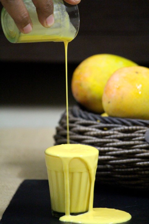 - In a pitcher add mango juice, milk and sugar and whisk vigourously until it becomes a thick smooth mass.
